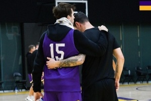 今日雷迪克现身湖人训练场,湖人官方晒出里夫斯与雷迪克拥抱鼓励的照片,配文写道:“为彼此而战!”