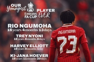 利物浦在俱乐部官方社交媒体上晒出了恩古莫哈的纪录,在他身后的是16岁8个月8天的尼奥尼,16岁9个月1天的埃利奥特,16岁11个月20天的赫维尔和17岁1个月27天的本-多克。