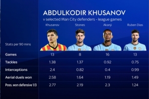 体育资讯1月11日讯 根据多家媒体的报道,曼城即将签下朗斯20岁中卫库萨诺夫,转会费4000万欧加奖金。天空体育对比了库萨诺夫和曼城部分中卫本赛季的联赛数据。