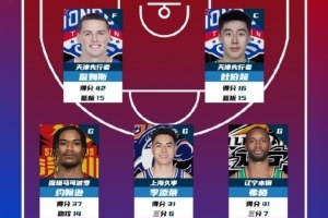 2024-2025赛季CBA联赛常规赛第29轮结束较量,来自天津荣钢篮球俱乐部的詹姆斯和杜伯超 、深圳新世纪烈豹篮球俱乐部的马凯尔-约翰逊、上海久事大鲨鱼李添荣和辽宁沈阳三生飞豹篮球俱乐部的凯尔-弗格入选CBA联赛常规赛第29轮最佳阵容!