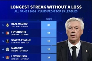 体育资讯1月12日讯 德国转会市场统计了前15名联赛球队2024年的战绩,并列出2024年最长不败排名,皇马36场不败居首,费耶诺德29场不败次席,曼城28场不败,勒沃库森26场不败。