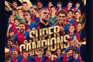 体育资讯1月13日讯 巴萨在西班牙超级杯决赛中5-2击败皇马,捧起冠军奖杯。
