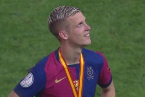 奥尔莫获得了加盟巴萨后的首个冠军,他亲吻奖杯,脸上露出笑容。