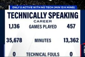 NBA现役仅康利和布罗格登生涯至今没吃过技术犯规(至少出场13000分钟)
