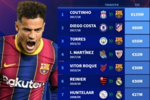 1、库蒂尼奥(利物浦→巴萨)——1.35亿欧