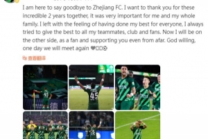 我在这里向浙江FC告别。我要感谢和你们在一起的这不可思议的两年,这对我和我的家庭来说都是一段重要的经历。我离开的时候,我感觉到我已经为每个人都尽了最大的努力,我一直尽我所能为所有队友、俱乐部和球迷提供最好的支持。现在我虽然改换门庭,但我会以一个球迷的身份一直支持着浙江队。上帝保佑,有一天我们会再次相见💚🙏🏾⚽️
