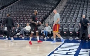 赛前,约基奇和前队友杰夫-格林拥抱寒暄。