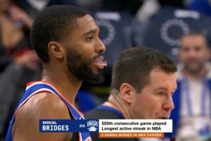 比赛中转播方把镜头给到尼克斯球员米卡尔-布里奇斯,并晒出数据:算上今天大桥已连续出战555场,这是现役球员的最长纪录。