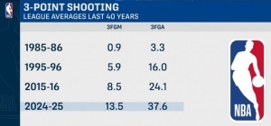 24-25赛季,场均37.6次出手,命中13.5个