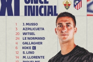 马竞首发:穆索、阿斯皮利奎塔、维特塞尔、勒诺尔芒、加拉格尔、科克、利诺、略伦特、里克尔梅、索尔洛特、科雷亚