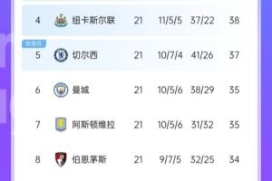英超第4的纽卡38分、第5切尔西37分、第6曼城35分、第7维拉35分、第8伯恩茅斯34分。4-8名的这5队最大分差仅有4分。