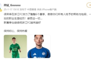 很荣幸在浙江FC效力了整整6个赛季,谢谢你们所有人给予的帮助与包容,一段难忘的职业生涯经历!感恩这一切…