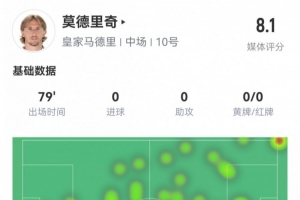 体育资讯1月17日讯 正在进行的国王杯,皇马2-1领先塞尔塔。此役莫德里奇首发79分钟被换下,球员全场重点数据如下↓