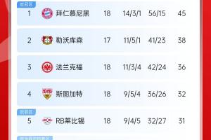 体育资讯01月19日讯 德甲第18轮今晚结束多场比赛,其中领头羊拜仁主场3-2战胜沃尔夫斯堡,先赛领先身后的勒沃库森7分。