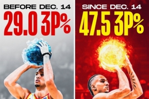 据统计,在赛季开始至北京时间12月15日这段时间,他的三分命中率仅为29%。而在那之后的12月16日至今,他的三分命中率达到47.5%。