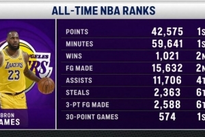 湖人主场迎战雄鹿,转播方晒出詹姆斯各项纪录: