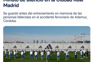 全体球员以及教练组成员在训练场上肃立,为近期发生在西班牙科尔多瓦省阿达穆斯地区的严重列车事故中的遇难者默哀一分钟,以此表达俱乐部对逝者的深切哀悼以及对受害者家属的慰问。