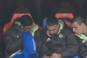 皇马替补席上,卡瓦哈尔、塞巴略斯、卢宁正在查看实时积分榜,目前皇马排名第8位,想要直接晋级16强,需寄希望于巴黎不进球。