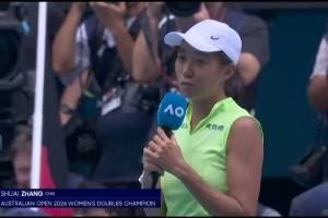 体育资讯1月31日讯 澳网女双决赛,4号种子张帅/梅尔滕斯击败达尼丽娜/克鲁尼奇,夺得搭档以来的首座大满贯女双头衔。在澳网女双夺冠演讲中张帅感谢了搭档的选择和郑洁的帮助。