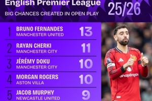 体育资讯2月10日讯 squawka统计了本赛季英超球员在运动战创造重大机会情况,曼联队长B费依然领跑。