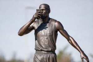 NBA Memes晒出了杜兰特的雕像(如新闻配图所示),并写道:“快讯:俄克拉荷马城雷霆计划在2026赛季结束时揭幕KD的铜像。”