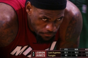 系列赛前5场比赛,热火以2-3落后,俨然已经在悬崖边上。詹姆斯在G6火力全开,全场26中19,三分4中2,罚球9中5,得到45分15篮板5助攻,率领热火以98-79击败凯尔特人,将系列赛拖至抢七大战。