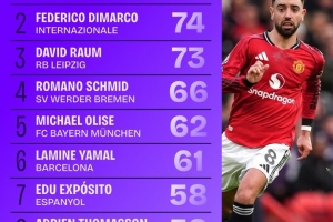 五大联赛创造机会榜:B费84次第一,迪马尔科第二,劳姆第三