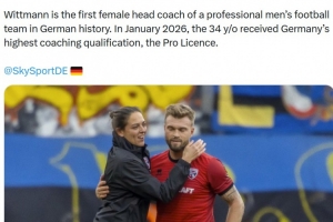 报道称维特曼自2024年5月起担任该队主教练。她是德国历史上首位执教职业男子足球队的女性主教练。2026年1月,34岁的她获得了德国最高级别的教练资格——职业级教练证书。