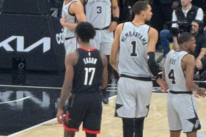在本场比赛中,伊森三次吃帽,其中两次是被文班盖掉;伊森妈妈更推道:“伙计们,我看出来了。那个男孩(伊森、2米03)在文班亚马(2米24)跟前看起来只有1米55(5英尺1英寸),他(文班亚马)一掌把我儿子扇回非洲了☹️。”