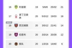体育资讯1月4日讯 英超第20轮,狼队3-0西汉姆联取得联赛首胜,20轮过后得到6分。目前狼队距排名第17的森林12分,西汉姆联没能缩小差距,仍距森林4分。最新积分榜如下: