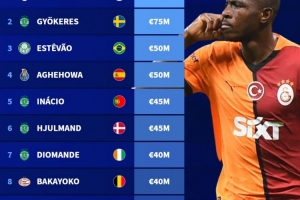 1(并列)、奥斯梅恩(加拉塔萨雷),7500万欧元