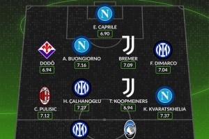 中场:普利西奇(米兰)、恰尔汗奥卢(国米)、库普梅纳斯(尤文)、克瓦拉茨赫利亚(那不勒斯)