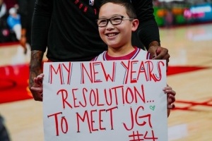 今天,一位小球迷举着“我的新年愿望就是见到杰伦-格林”的牌子现场观战,杰伦-格林暖心与他合影,并为他的球衣签名。