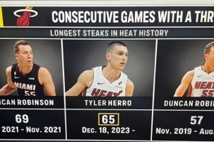 这样一来,希罗已经连续65场比赛命中三分,目前排名队史第二位,队史纪录为邓肯-罗宾逊的69场。