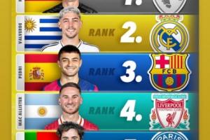 在这次评选中,克罗斯排名第一,巴尔韦德排名第二,佩德里排名第三,麦卡利斯特排名第四,维蒂尼亚排名第五。