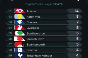 本赛季英超定位球创造重大机会排名: