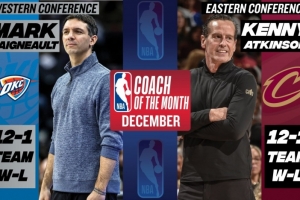 体育资讯1月3日讯 今日NBA官方宣布,雷霆主帅戴格诺特与骑士主帅阿特金森在12月中被评为西部和东部联盟月度最佳教练。