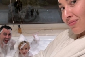 哈维在社交媒体上晒出与孩子泡澡的照片,他的妻子努莉亚-库尼莱拉则在一旁比出V字手势。