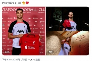 利物浦官方社媒晒出加克波加盟时的照片,并配文:“成为红军两周年。”