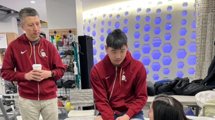 中国男篮主帅郭士强抵达纽约,探望在进行术后康复治疗的崔永熙(前十字韧带撕裂),郭指导满眼都是关心