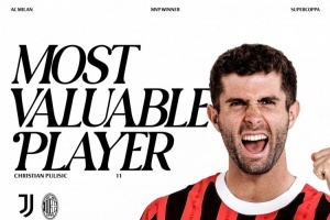 米兰官方社媒晒出普利西奇的海报,宣布他当选意大利超级杯半决赛米兰队内最佳球员。