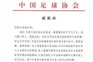 2024年是中国足球走出低谷、眺望曙光的不平凡之年。我们勠力同心、爬坡过坎,共同为中国足球更美好的明天而拼搏。值此岁末年初,中国足协祝福贵俱乐部和球员新年快乐、阖家安康、诸事顺遂!衷心感谢贵俱乐部2024年对中国国家足球队的大力支持和无私帮助,衷心感谢河南俱乐部国家队球员为国家荣誉而拼搏的奉献精神。中国足球队今年在精神面貌和比赛成绩上有所起色,离不开贵俱乐部和球员全身心的付出和拼搏。