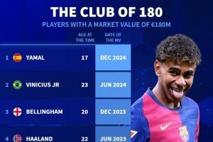 体育资讯1月4日讯 德国转会市场盘点了身价曾达到1.8亿欧的球员,梅西、姆巴佩、亚马尔在列。