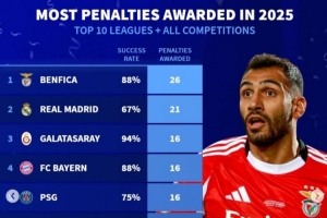 体育资讯1月5日讯 《转会市场》统计了2025年前十联赛俱乐部各项赛事共计获得点球情况及其命中率,本菲卡26球居首。