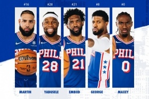 76人本场首发为:恩比德、马克西、乔治、亚布塞莱、凯莱布-马丁。