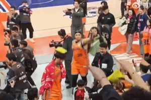 赛后,上海球迷再次为洛夫顿献上“薯片雨”,但其中一包正好砸在王哲林头上,洛夫顿见状也伸手示意要小心。