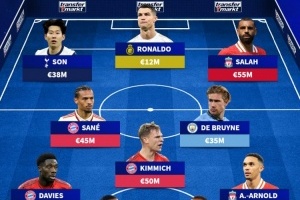 前锋:孙兴慜(3800万欧)、C罗(1200万欧)、萨拉赫(5500万欧)
