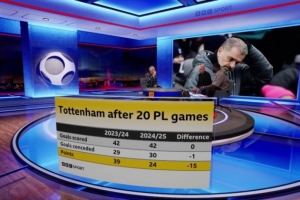 BBC统计了热刺近两个赛季英超前20轮的数据,并作出对比,两个赛季热刺同期进球、失球相当,但本赛季少了15分。