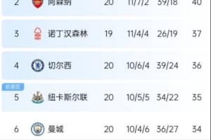 英超第20轮,曼城4-1大胜西汉姆。暂时在积分榜位居第6,但只距离第四的切尔西2分。