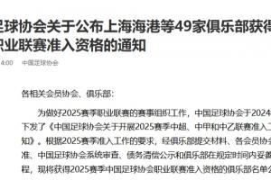 体育资讯01月06日讯 中国足协公布2025赛季准入名单,沧州雄狮(中超)、广州队(中甲)、湖南湘涛(中乙)未在列,49家俱乐部获得准入资格。